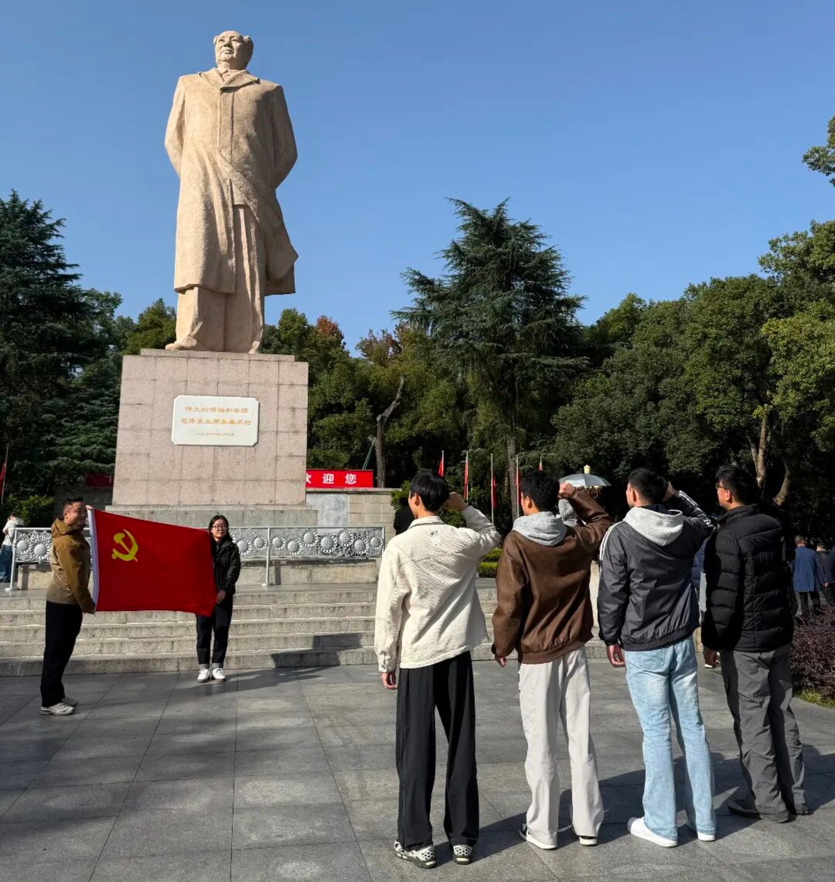 岳麓山畔,毛主席塑像巍然屹立,鲜红党旗迎风招展。全体党员在东方红广场上面向党旗庄严宣誓,铿锵誓言回荡广场,展现了体育学子传承红色基因、勇担时代使命的坚定决心。