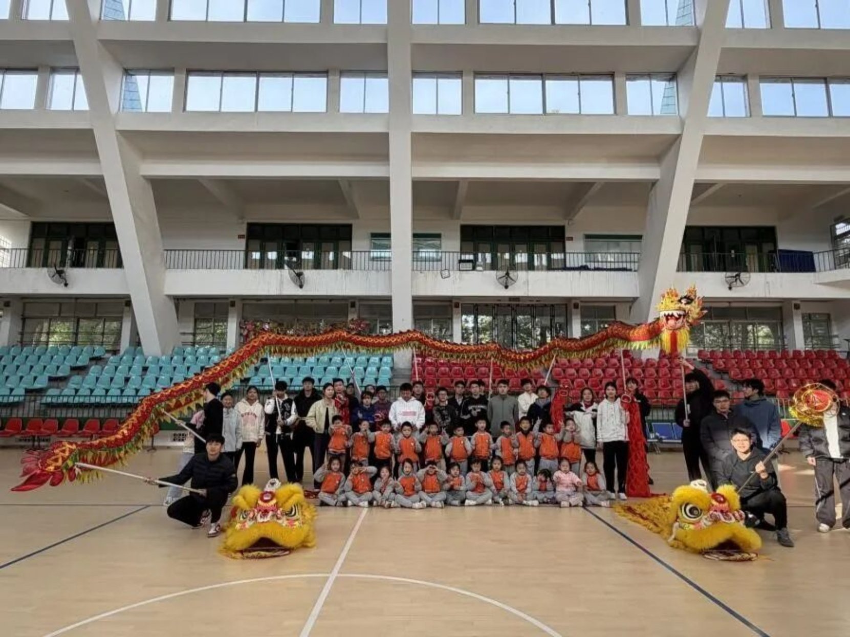 活动尾声,23级体育教育专业的学子们与萌娃们围绕龙狮道具合影留念,镜头定格下一张张灿烂的笑脸,也定格了非遗传承的温暖瞬间。对于学子们而言,这堂特殊的课程让他们深刻体会到非遗传承的意义;对于萌娃们来说,与大哥哥大姐姐的亲密互动,让传统文化的种子悄然扎根心田。