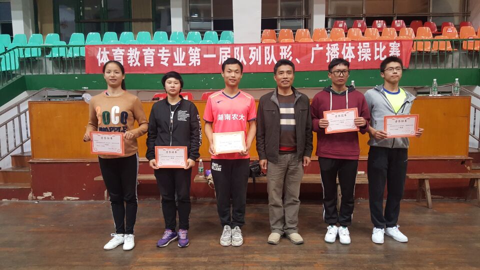 本次比赛分为队列队形和广播体操展示两个环节。体育教育专业有60名员工参赛,比赛分为12个小组进行。2015级5组获得一等奖;2016级7组、2015级4组分获二等奖;2015级1组、2015级2组、2016级12组分获三等奖。