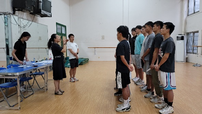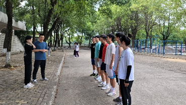9月12-14日全天,主要培训口令、队列队形和实践教学环节。作为常规培训内容的口令和队列队形练习分为小组训练,每人依次轮换角色进行模拟练习。在一声声铿锵有力的口令中,体院学子展现出了他们昂扬向上的精神风貌。