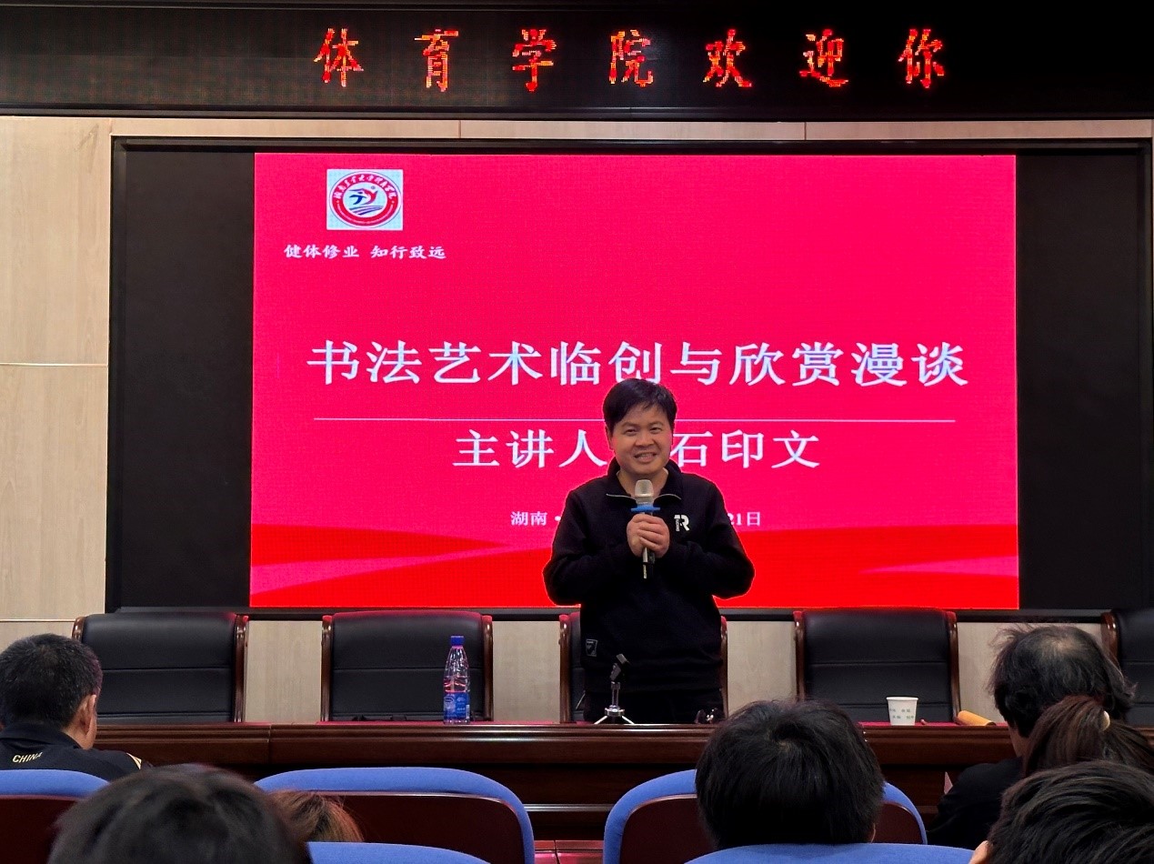 石印文则以书法艺术临创与漫谈为主题,向师生讲述了书法艺术创作的历史渊源、创作方法以及创作实践中的体会与感悟。他对如何实现中国书法艺术在当代艺术体系中的传承与发展提出了自己的看法,并对所有员工提出要求,希望大家能坚持书写,讲究规范,深入研究,懂得欣赏。