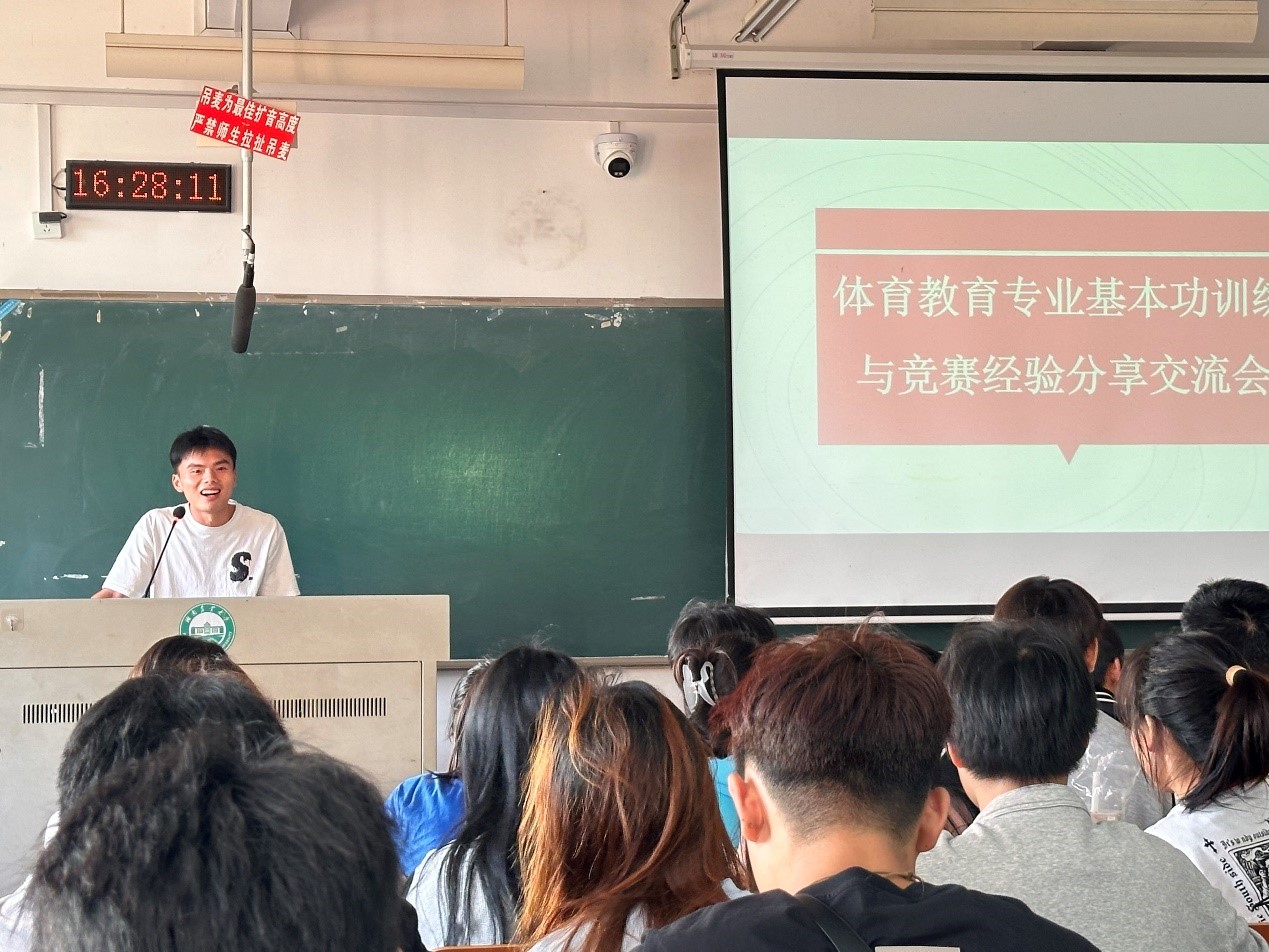 参赛员工代表屈双洋、侯斌通过分享抽签选中后的心情、训练备赛、比赛感想,对2022级体育教育专业的同学们提出重视日常学习、面对比赛保持不畏惧、理解专业差异、相信自己、相信老师!