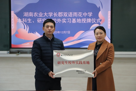 仪式现场,张素芬向长郡双语雨花中学罗周清董事长授予“长沙市长郡双语雨花中公司外实习实践基地”、“研究生校外实践基地”牌匾。