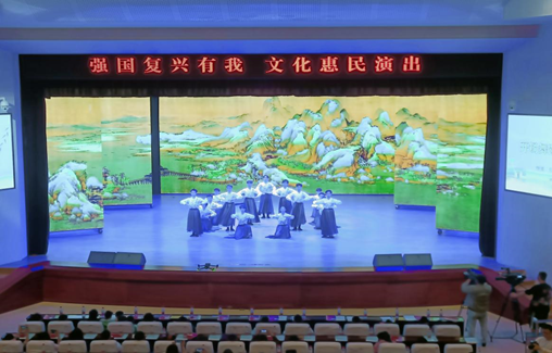 系主任李鑫副教授指导的舞蹈《国风墨韵》作为此次活动的开场舞。只见,众书生月夜玩闹观月,洒脱酒醉于竹林之中;众书生持一墨扇,俯仰吟咏之乎者也;众书生相互作揖,仁义礼智信尽含其中。15位舞者将书生的喜怒哀乐跃然台上,好一个“恰同学少年,风华正茂;书生意气,挥斥方遒”。