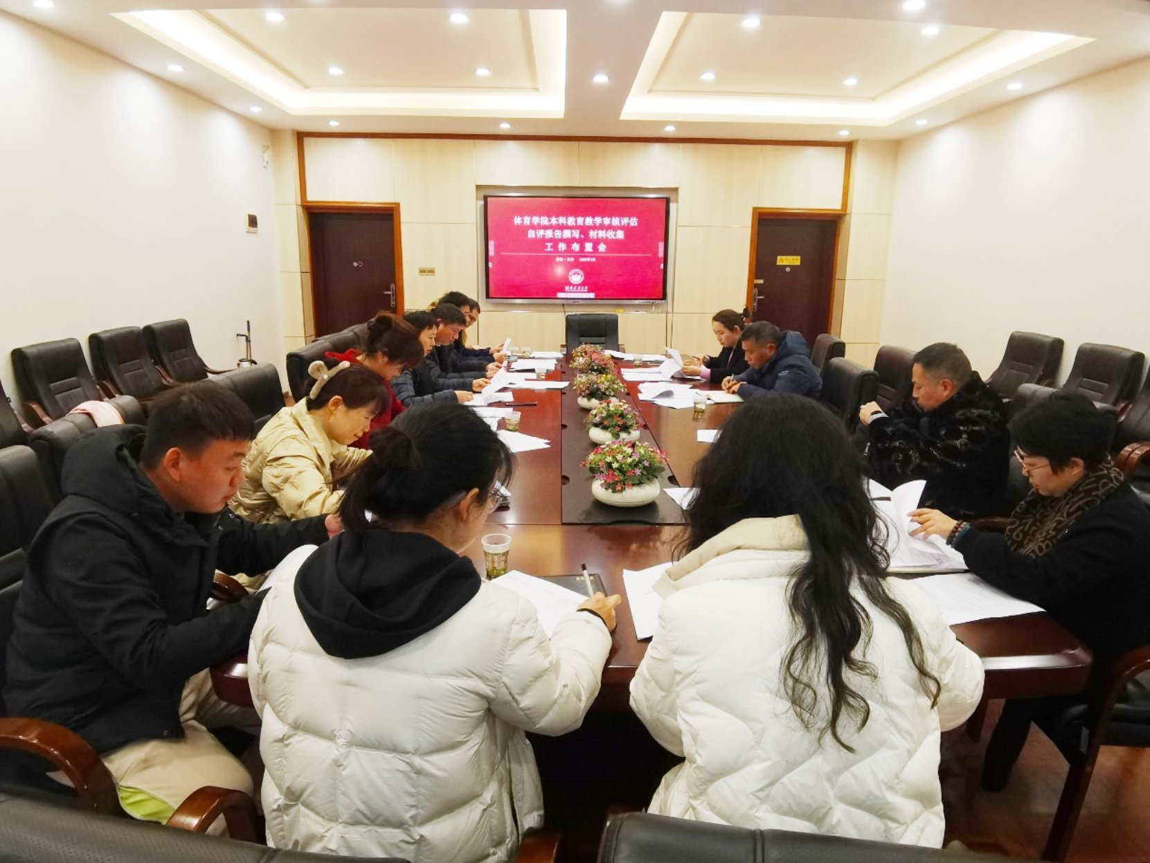 刘周敏带领所有老师一起查看“自评报告撰写任务”和“审核评估支撑材料提交”任务分解表,并逐一对审核重点、内涵详解、支撑材料等内容进行阐述和工作布置,并提出建议。
