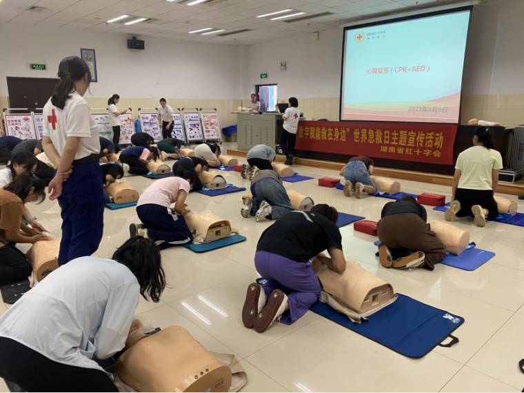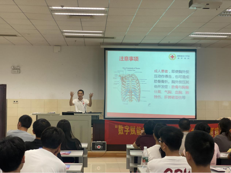 湖南省红十字会应急救护师金灿通过案例分析、情景模拟、互动交流等形式开展专题讲座,金灿为参训学员们详细讲解了红十字运动、心肺复苏、AED和气道异物梗阻的基本理论知识,并演示了相关救护操作。