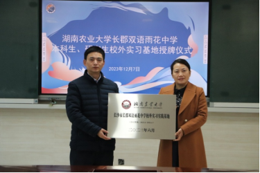 仪式现场,张素芬向长郡双语雨花中学罗周清董事长授予“长沙市长郡双语雨花中公司外实习实践基地”、“研究生校外实践基地”牌匾。