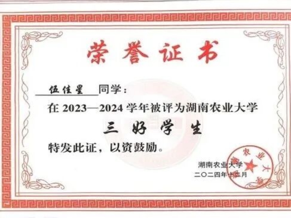 伍佳星从入学以来,遵守校规校纪,尊敬师长,团结同学,在班级中主动发挥模范带头作用,多次参与公司组织的志愿服务活动(如全民健身挑战日、守护浏阳河堤等),2024年暑假在长沙县三中学担任体育实习教师,负责初三员工体育特长生训练,教学认真、组织有序。2025年寒假参加老员工返家乡社会实践,在安沙镇政府民生事务办担任实习生,服务于基层,参加春节慰问,寒假一小时阅读志愿活动以及看望敬老院的老人等等组织活动,荣获“优秀实习生”,践行“奉献、友爱、互助、进步”的志愿精神。