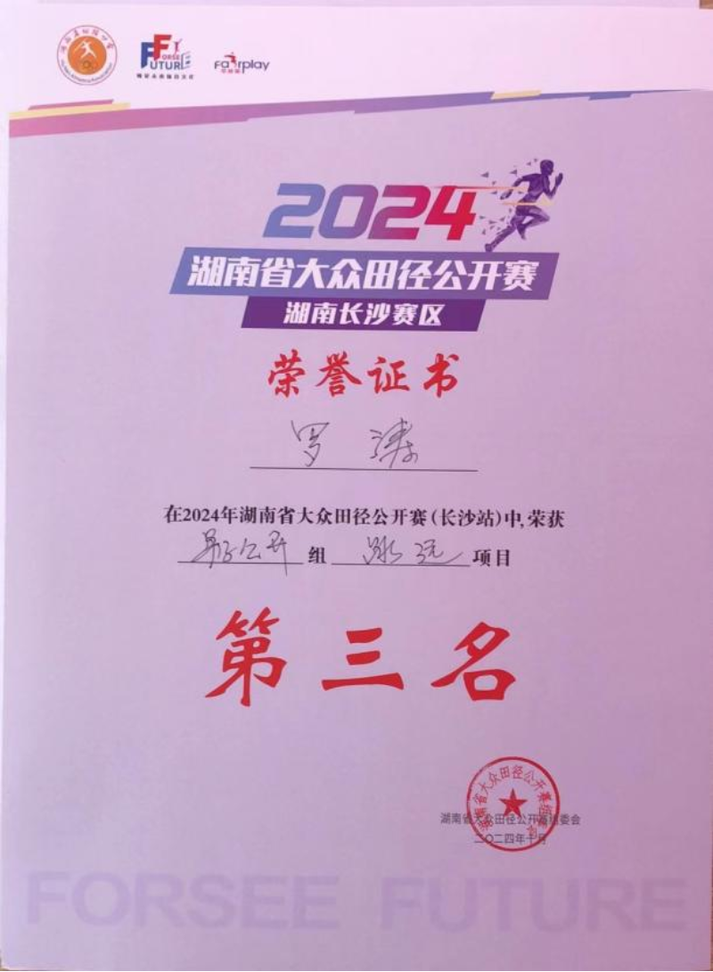 在专业技能上他也表现出许多亮点,罗涛同学积极践行“学以致用”的原则,在湖南省公开赛跳远中获得第三名、修业杯篮球赛第一名、校级三级跳远第二名等。考取田径一级裁判员、篮球二级裁判员、排球二级裁判员、中国田径初级教练员、游泳指导员、游泳救生员等职业证书。在其他时间内罗涛同学也会做一些与专业相关的兼职以此来为家庭减少开支负担。