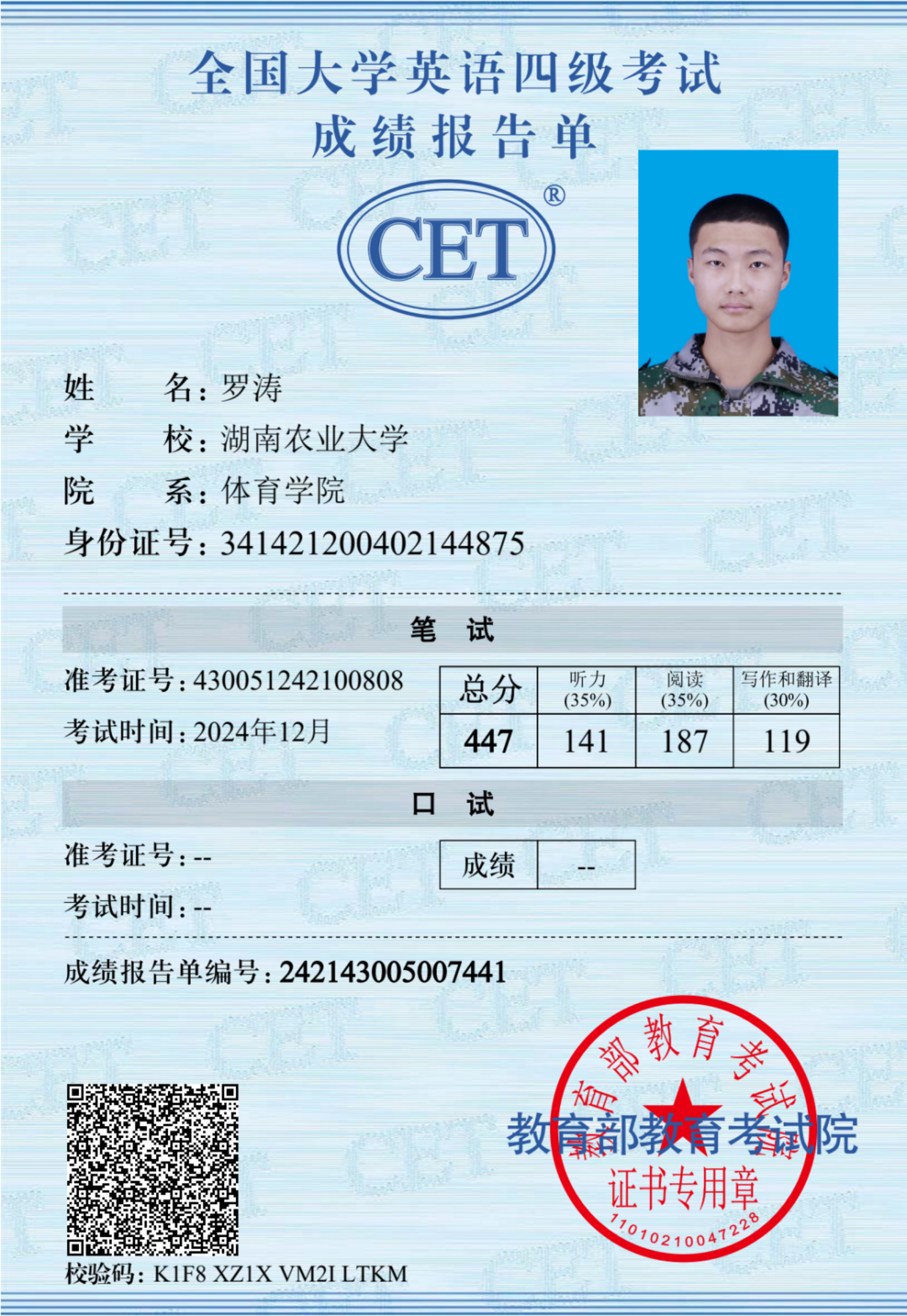 罗涛同学在大学期间担任着班长以及公司员工会干部,做事情始终尽职尽责有着高要求。他成绩优异因此曾获得国家励志奖学金、校级一等优秀员工奖学金、三好员工以及优秀团员等荣誉。在2025年6月他参加了湖南省体育教育专业基本功大赛,并且取得团体总分三等奖、个人基础理论知识与教学技能第二名以及团体一等奖的好成绩,体现了良好的学习能力和专业素养。高中阶段他学习日语,大学期间通过自学英语并通过了英语四级考试和计算机二级等级考试。