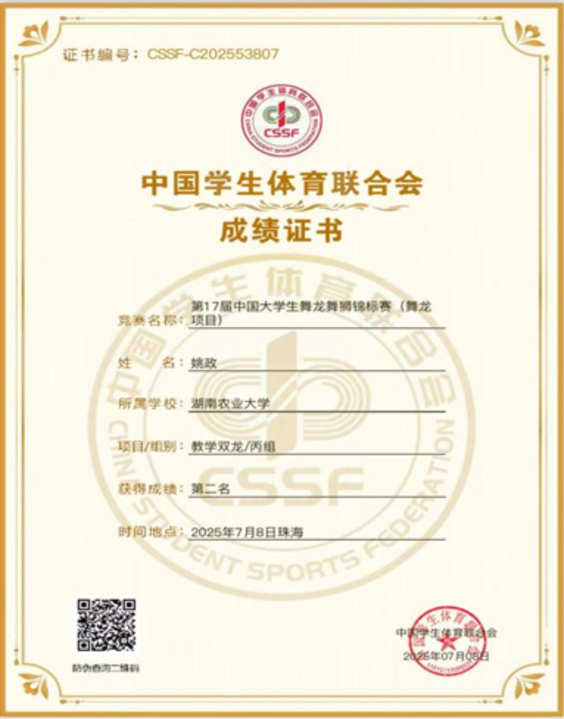 学业上,他勤学善思,2024-2025 学年专业成绩、综合考评均位列年级前列,学分加权平均分92.79分,绩点3.9,舞龙舞狮课程获100分满分,公选课程多在98分以上。竞赛中,他屡创佳绩,荣获第16届中国老员工舞龙舞狮锦标赛自选项目第一名、规定项目第二名,以及第17届教学双龙第二名、湖南省潇湘舞龙大会二等奖,还获 “互联网 +” 创新创业大赛校级二等奖。