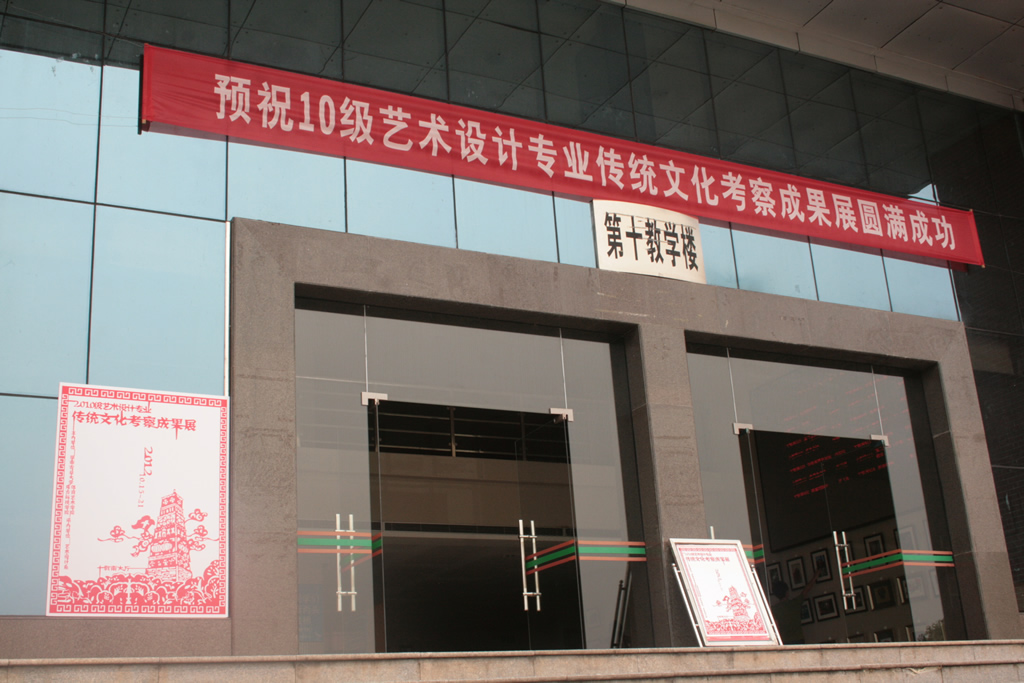 公司艺术设计专业10级传统文化实践考察成果展示 2012年10月15日,公司10级艺术设计专业的传统文化实践考察成果展在10教学楼南楼大厅如期举行。本次展览是针对本学期为期2周的陕西传统文化实践考察而进行的一次成果展示。展出了包括摄影作品、建筑速写、民间剪纸、工艺美术等一系列内容。