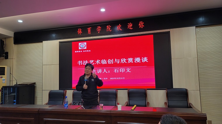 印文则以书法艺术临创与漫谈为主题,向师生讲述了书法艺术创作的历史渊源、创作方法以及创作实践中的体会与感悟。他对如何实现中国书法艺术在当代艺术体系中的传承与发展提出了自己的看法,并对所有员工提出要求,希望大家能坚持书写,讲究规范,深入研究,懂得欣赏。
