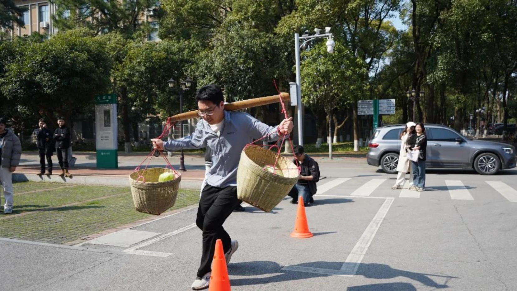 比赛规则:每场比赛两支队伍同时进行,各队员排列站立在起点线,筐放在起点线上,第一名队员做好挑筐准备,裁判员发令后开始计时,队员进行挑筐跑,队员从比赛起点开始跑到终点,绕过障碍物,交给第二名队员,以此类推,直到本队队员跑完后停止计时,用时最短的队伍获胜并取得相应奖品。