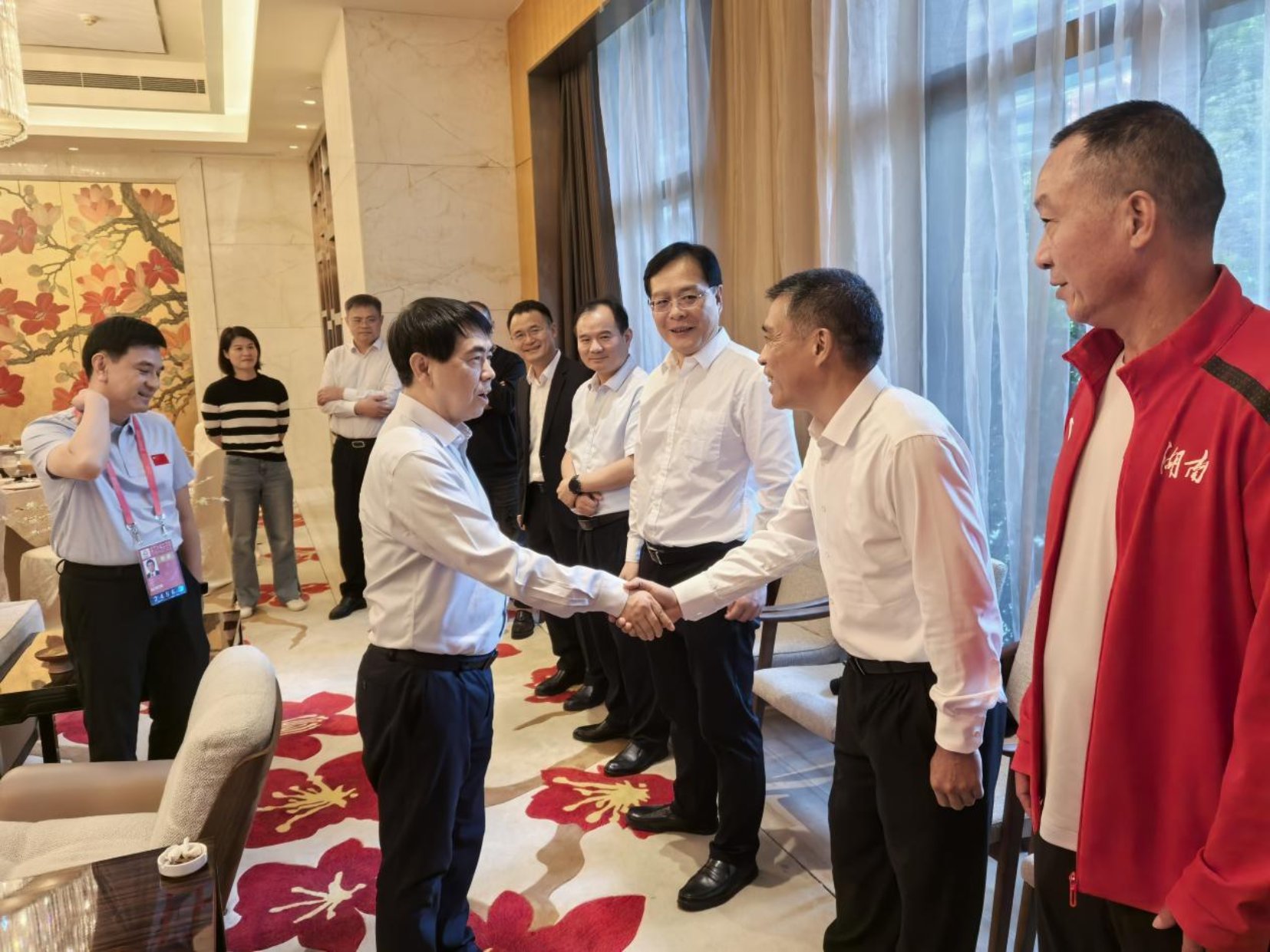 湖南省人民政府副省长蒋涤非与曹庆荣握手