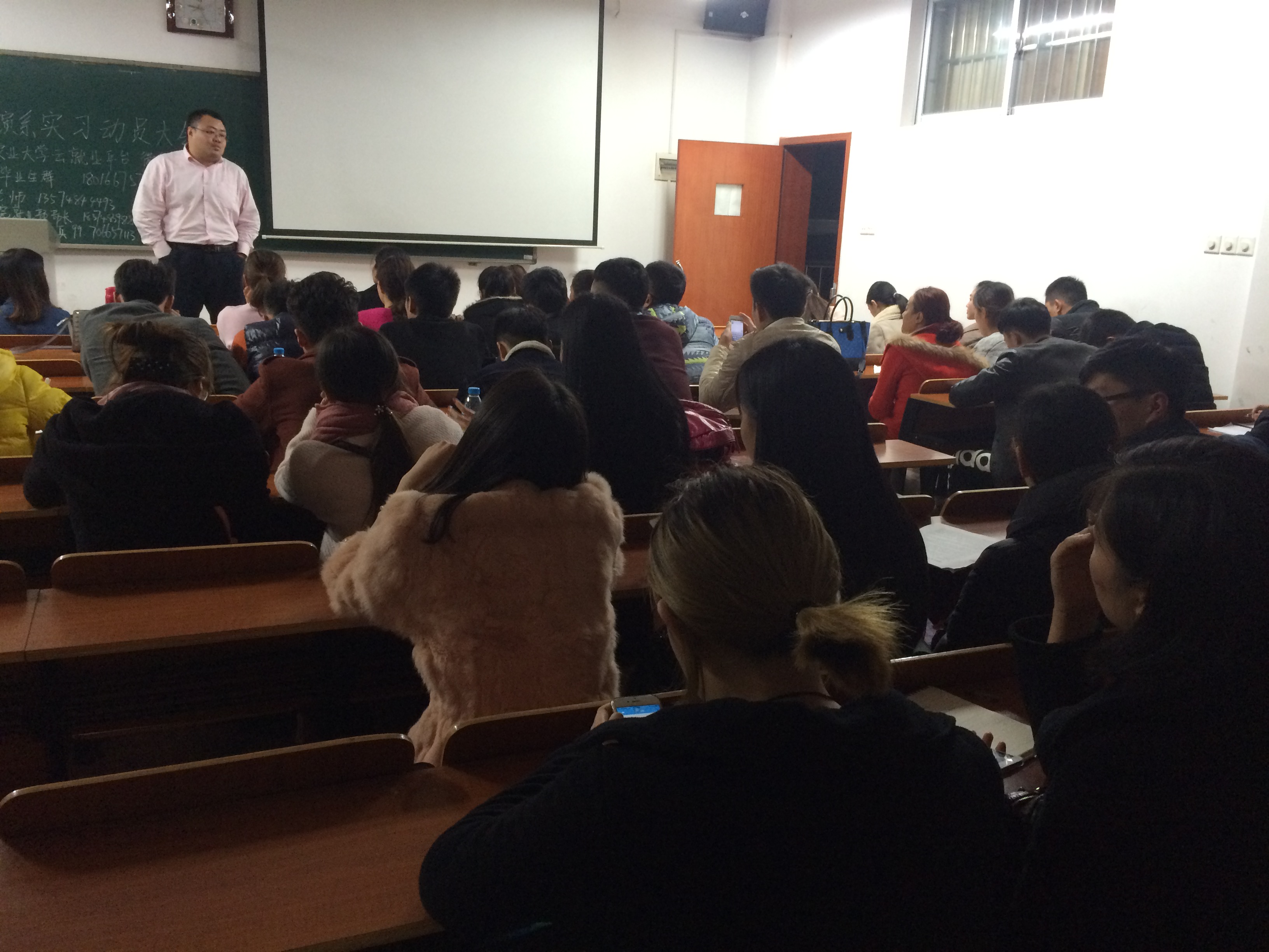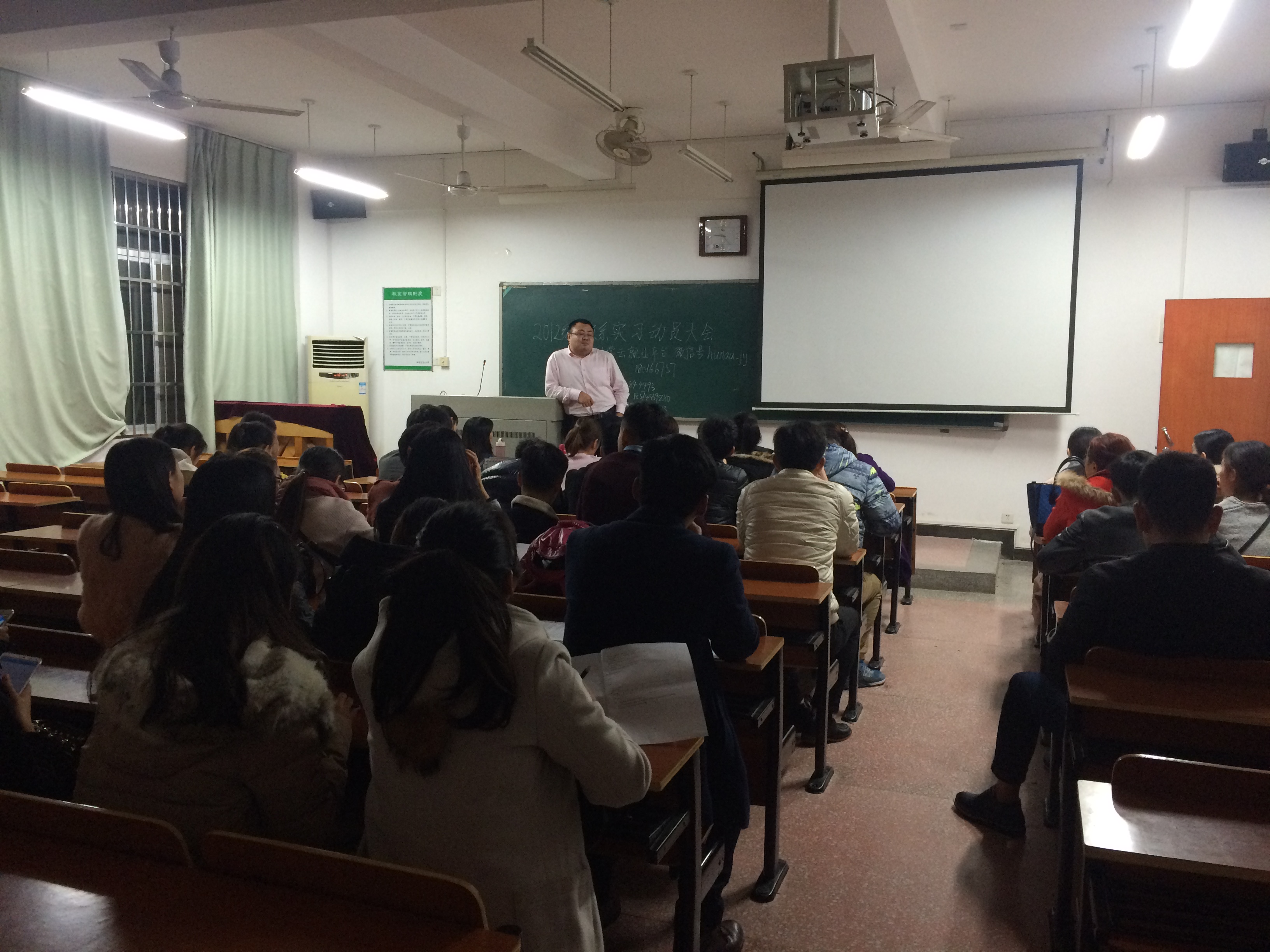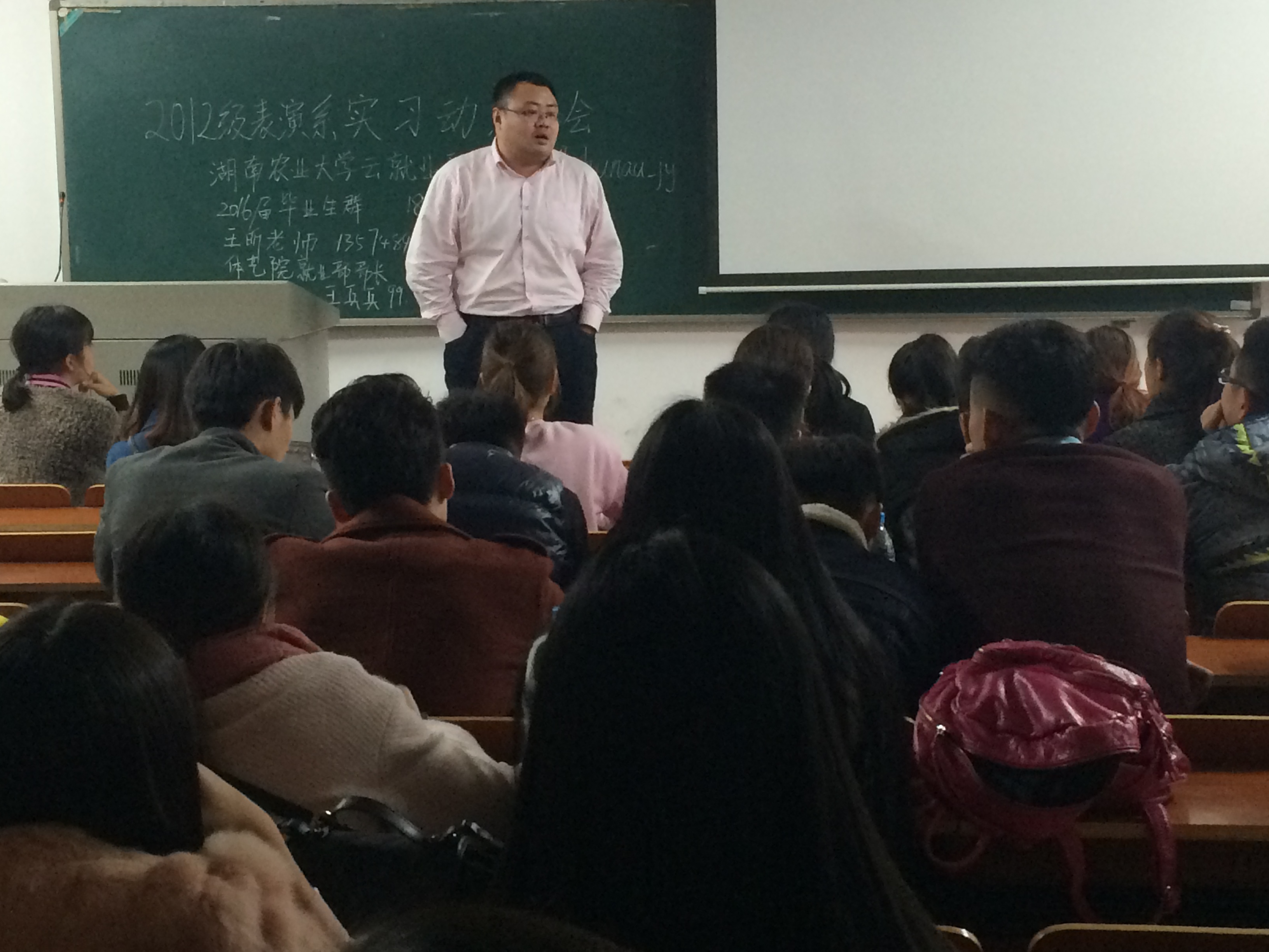 11月18日,体育艺术公司在十教南137举行2012级表演系实习动员大会,本次讲座邀请了学工组王老师,参与活动的人员是体育艺术公司表演系全体员工。首先,王老师先交代了一些毕业生前该准备什么,需要做些什么。告诉毕业生很多他们自己不知道的知识。