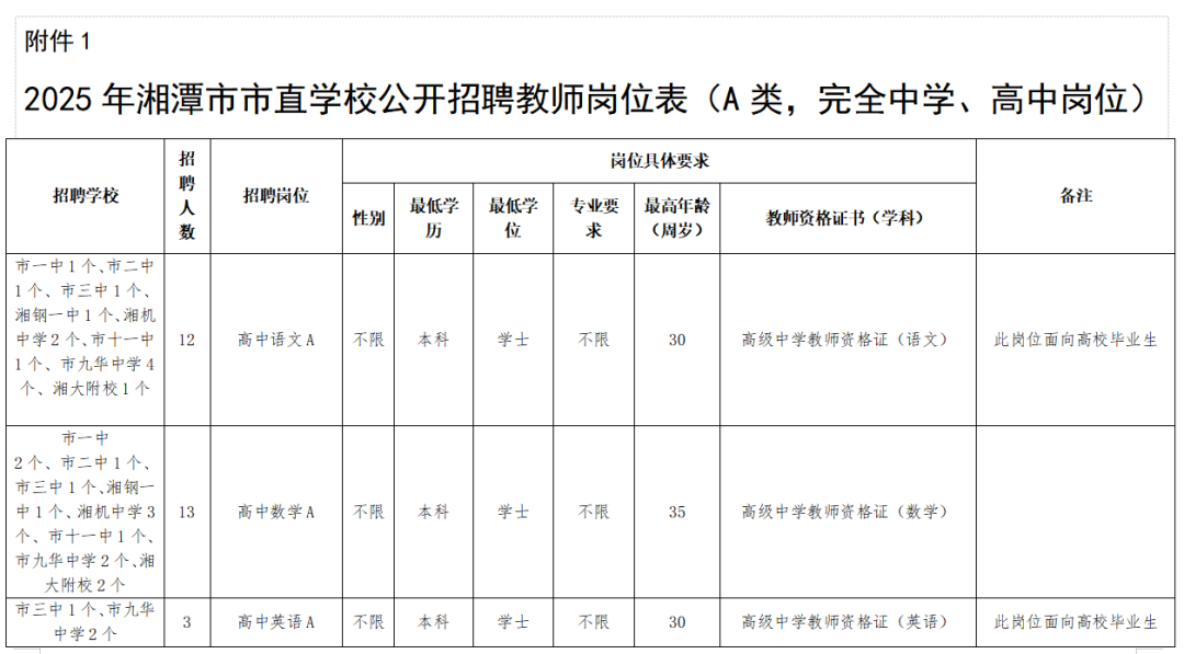 1.本次市直公司公开招聘98名教师,为事业编制教师。其中A类岗位55名,为完全中学、高中教师,A类岗位试教内容为高中;B类岗位4名,均为初中教师(需具备高中教团队格证);C类岗位13名,均为初中教师;D类岗位3名,均为幼儿园教师;E类岗位23名,为小学、特殊教育、实践基地、开放大学、中职、专门公司教师。具体招聘计划与岗位见《2025年湘潭市市直公司公开招聘教师岗位表》(以下简称《岗位表》)。详情可查询湘潭市教育局官网和湘潭市人社局官网。