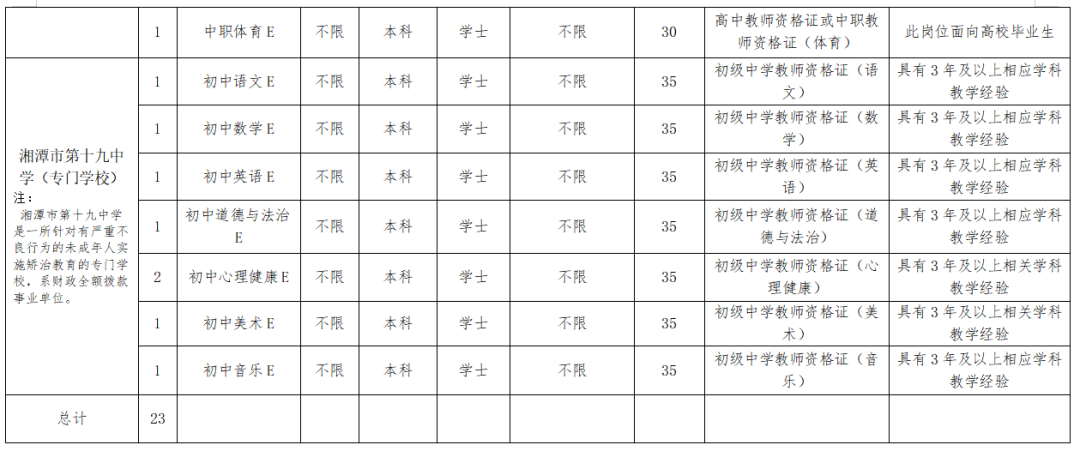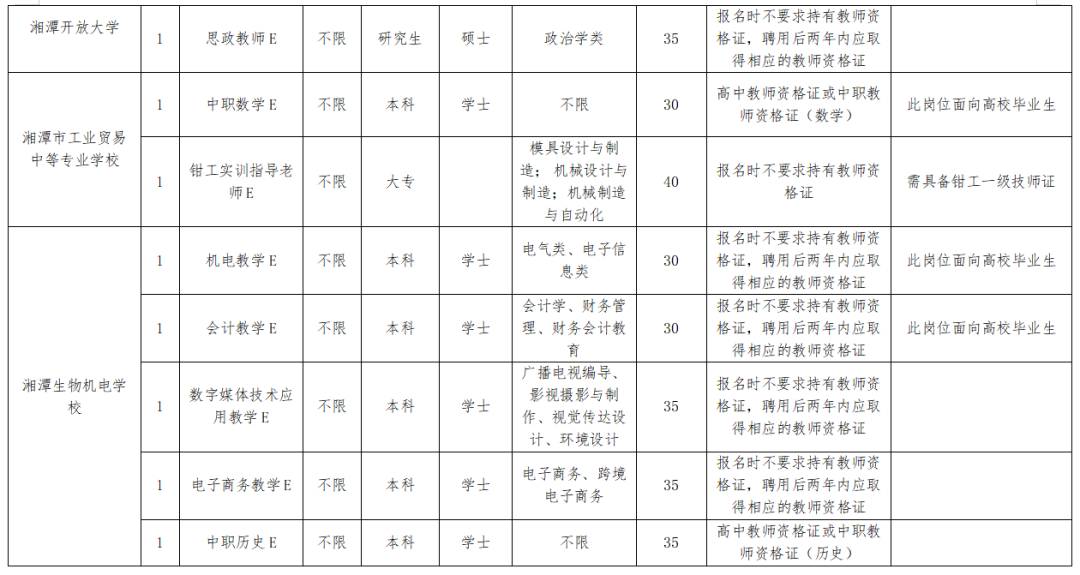 3.市一幼、市二幼学前教育D;市特殊教育公司特殊教育E1;市示范性综合实践基地陶艺教学E、播音主持教师E;湘潭开放大学思政教师E;市工业贸易中等专业公司钳工实训指导老师E;湘潭生物机电公司机电教学E、会计教学E、数字媒体技术应用教学E、电子商务教学E需符合相应的专业要求,其他岗位不做专业要求,但须具备与岗位相符的教团队格证。(具体要求见附件1)