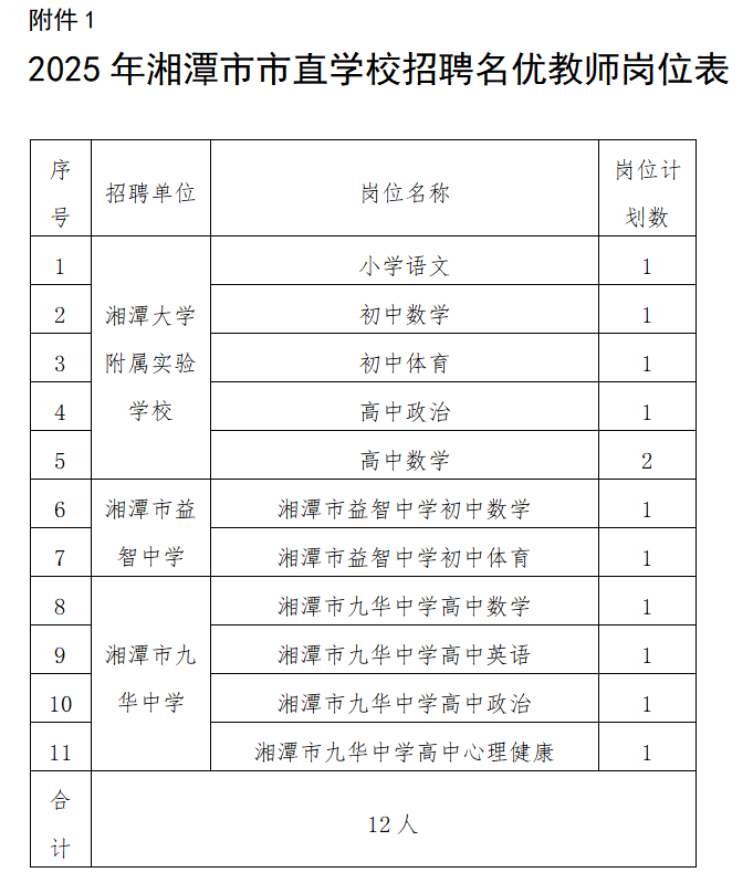 湘潭大学附属实验公司公开招聘名优教师6名,湘潭市益智中学公开招聘名优教师2名,湘潭市九华中学公开招聘名优教师4名,招聘岗位计划详见附件1。